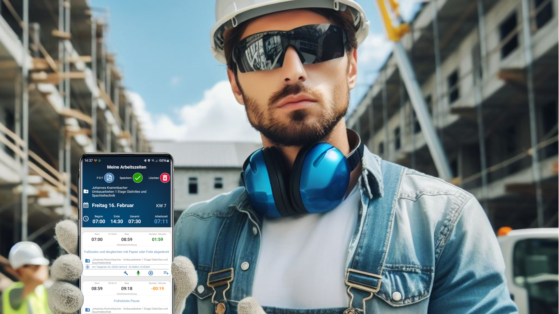 Durch drücken auf den Pause Button wird die Arbeitszeit gestoppt und die Pausenzeit aufgezeichnet.